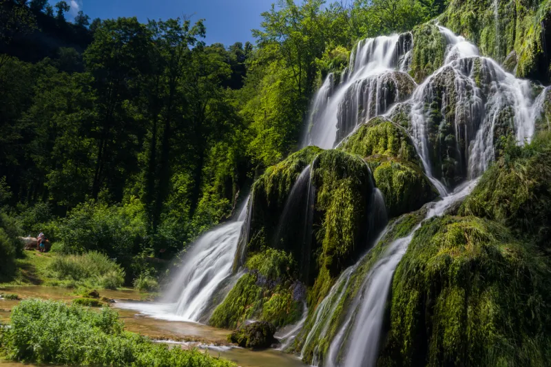Chargée en calcaire, l’eau qui jaillit au fond de la reculée forme une nouvelle roche : le tuf. Enrobés de calcaire, végétaux, algues et mousses donnent naissance à cette cascade pétrifiante, véritable sculpture de la nature.